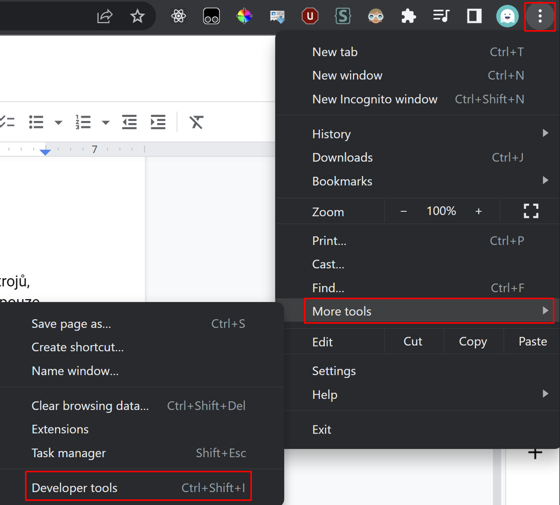 DevTools spustíš tak, že zmáčkneš na Windows ctrl+shift+i či na MacOS command+option+i nebo kliknout pravým tlačítkem myši a dát prozkoumat (Inspect). Dalším možným způsobem je klávesa F12. (pokud máš F klávesy nastavené na speciální funkce, tak FN+F12). Jednou z posledních možností je kliknout na tři tečky vpravo nahoře > Další nástroje (More tools) > Vývojářské nástroje (Developer tools).