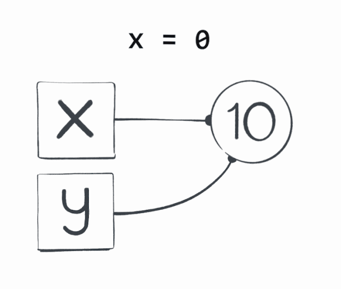 Drát nikdy nespojuje dvě jména, pokud napíšeš, že nějaká proměnná se rovná jiné, tak jejich drát momentálně vede ke stejné hodnotě. Podobně jako neřešíš u misek na bonbony, jestli se rovná jejich barva, ale kolik bonbonu mají.