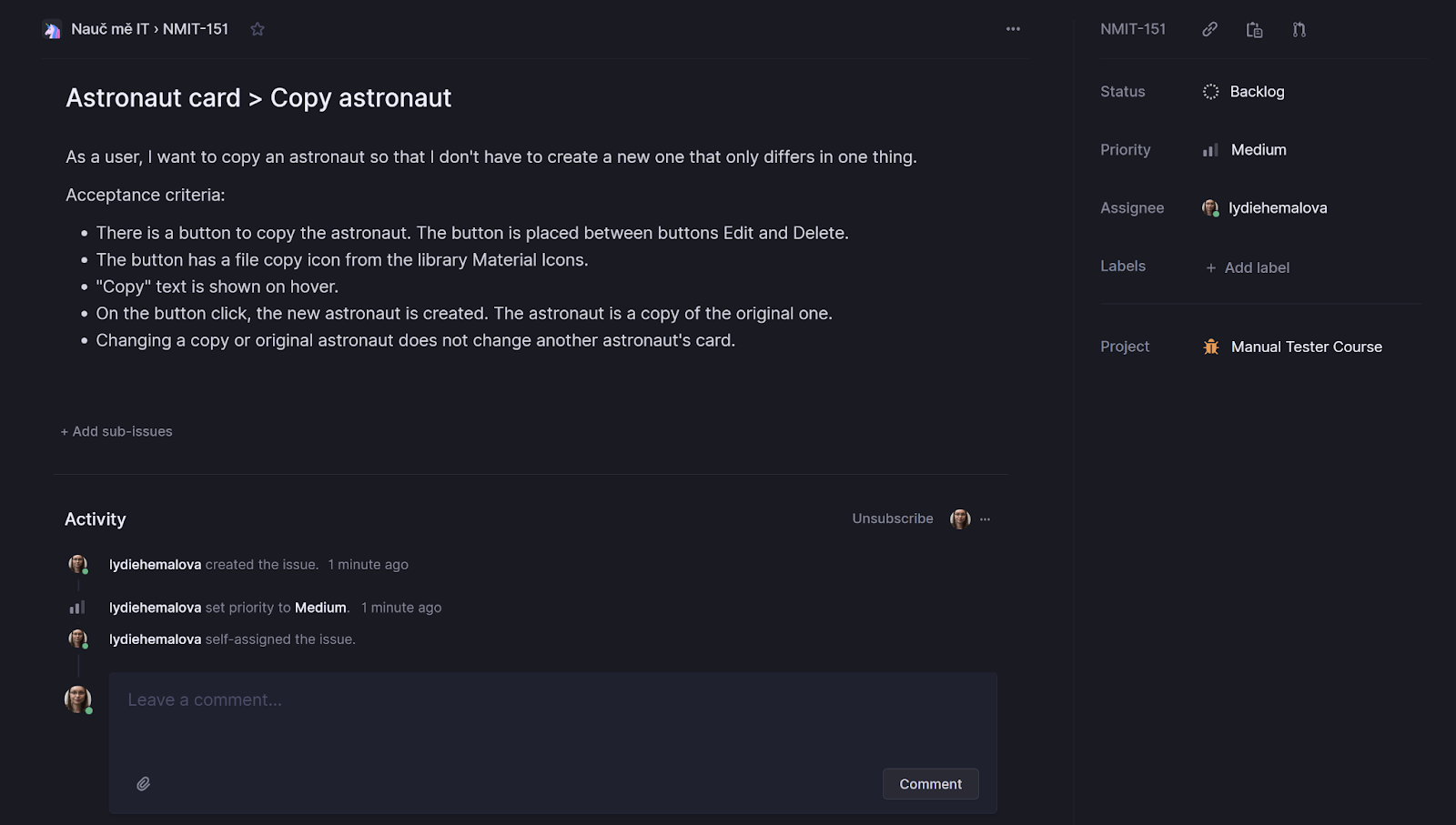 Práci testera, který verifikuje vývojářovu práci, si můžeš vyzkoušet. Do naší aplikace jsme přidali novou funkci - kopírování existujícího astronauta. Níže na obrázku si můžeš prohlédnout, jak může takové zadání úkolu (tasku) pro vývojáře vypadat. Se stejným zadáním pracuje následně tester. Jedná se o ukázku z online nástroje Jira, který se používá pro správu projektů. Jira má na měsíc licenci na vyzkoušení. Doporučujeme si založit účet a zkusit si ji proklikat. V nastavení by měla jít vybrat čeština. Neuvádíme zde návod, jak ji používat, protože je to intuitivní a vždy je potřeba si nechat od týmu vysvětlit, jak přesně ji používají, protože názvosloví se může lišit. Existují i jiné nástroje, např. YouTrack, ClickUp, Linear. Toto není exkluzivní výčet, nástrojů je celá řada a v mnohém se liší. Pokud si vyzkoušel proklikat Jiru, můžeš zkusit například i Linear, který je zdarma. Nauč mě IT používá Linear, ale mnoho firem je spíše konzervativních a používá Jiru.