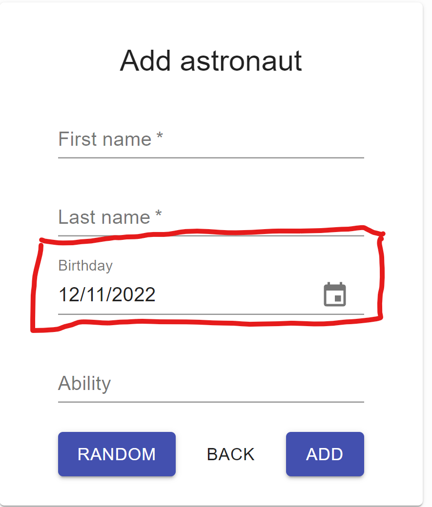 Při vytváření astronauta nefunguje tlačítko random, které by mělo předvyplnit vytvářecí formulář. Na Githubu si můžeš prohlédnout Github Issue s nahlášenou chybou v češtině a v angličtině.