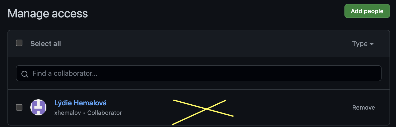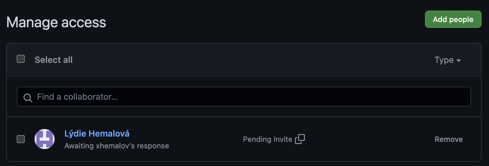 V kapitole 8 ses naučil princip Gitu, včetně webu Github a forkování. Bude tedy nutné si projekt forknout k sobě a přidat „spolupracovníky“, to uděláš v Settings -> Collaborators -> Add people -> xhemalov. To zopakuješ znovu, akorát přidáš uživatele pegak. Na začátku by tvá obrazovka měla vypadat podobně: