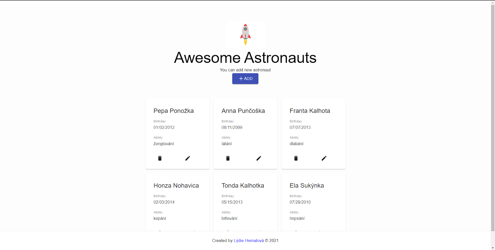 Po kliknutí na tlačítko RANDOM se formulář předvyplní náhodnými informacemi o astronautovi. Tlačítko BACK vrátí uživatele zpět na úvodní stránku. Tlačítko ADD přidá astronauta, pokud záznam splňuje požadavky uvedené výše. Datum lze napsat nebo vybrat z datepickeru.